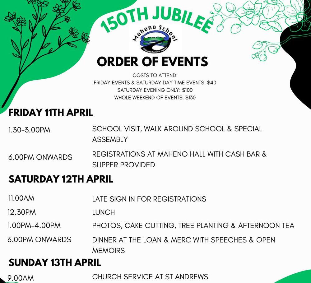 Please check out our website for more details https://www.maheno.school.nz/our.../150th-jubilee-reunion