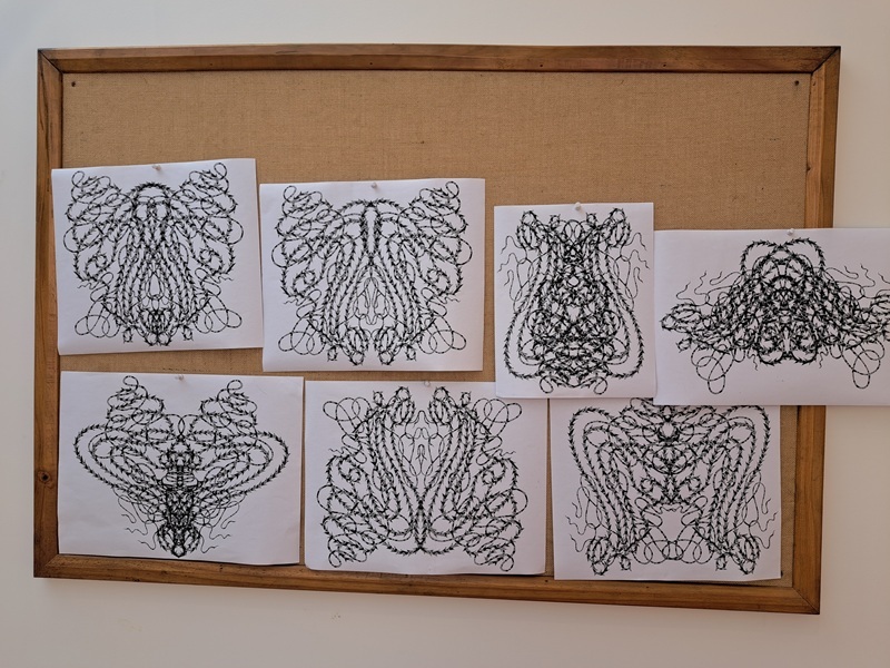The works she is making are painstakingly intricate. Once she had her shape, she photocopied it onto a transparent sheet, and then played around with putting duplicates of the same design together and on top of each other to make different forms.