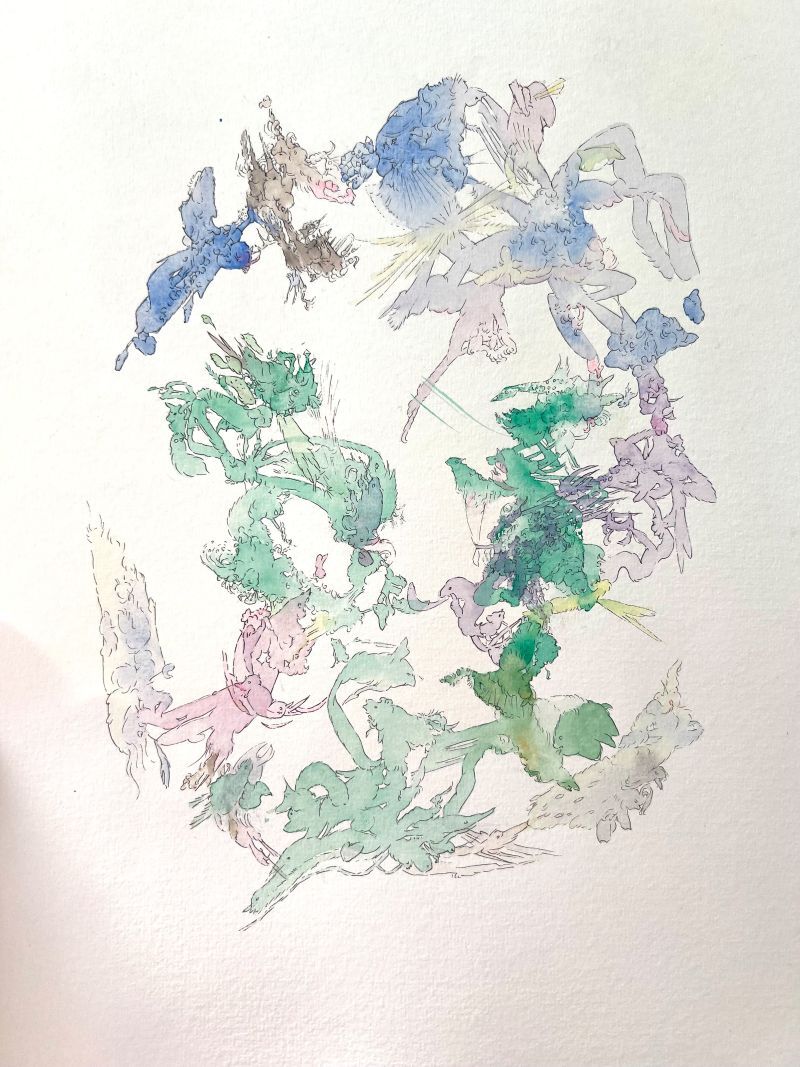 In her breaks from working on her Crucible pieces, Motoko produces artwork using watercolours and calligraphy ink.