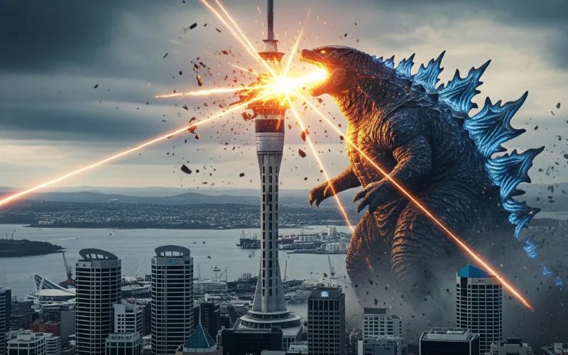 Did Godzilla attack downtown Auckland? Sorry, it's just AI. Photo: Made with Google AI via RNZ