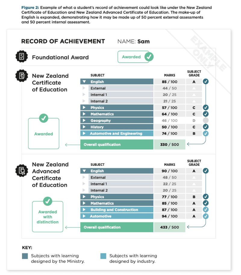 An example of what a student’s record of achievement could look like under the New Zealand Certificate of Education and New Zealand Advanced Certificate of Education. Graphic: Supplied/Ministry of Education via RNZ