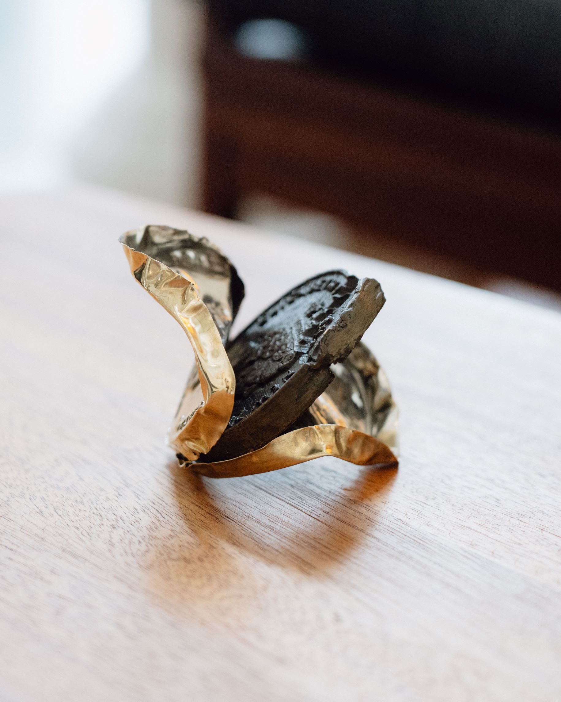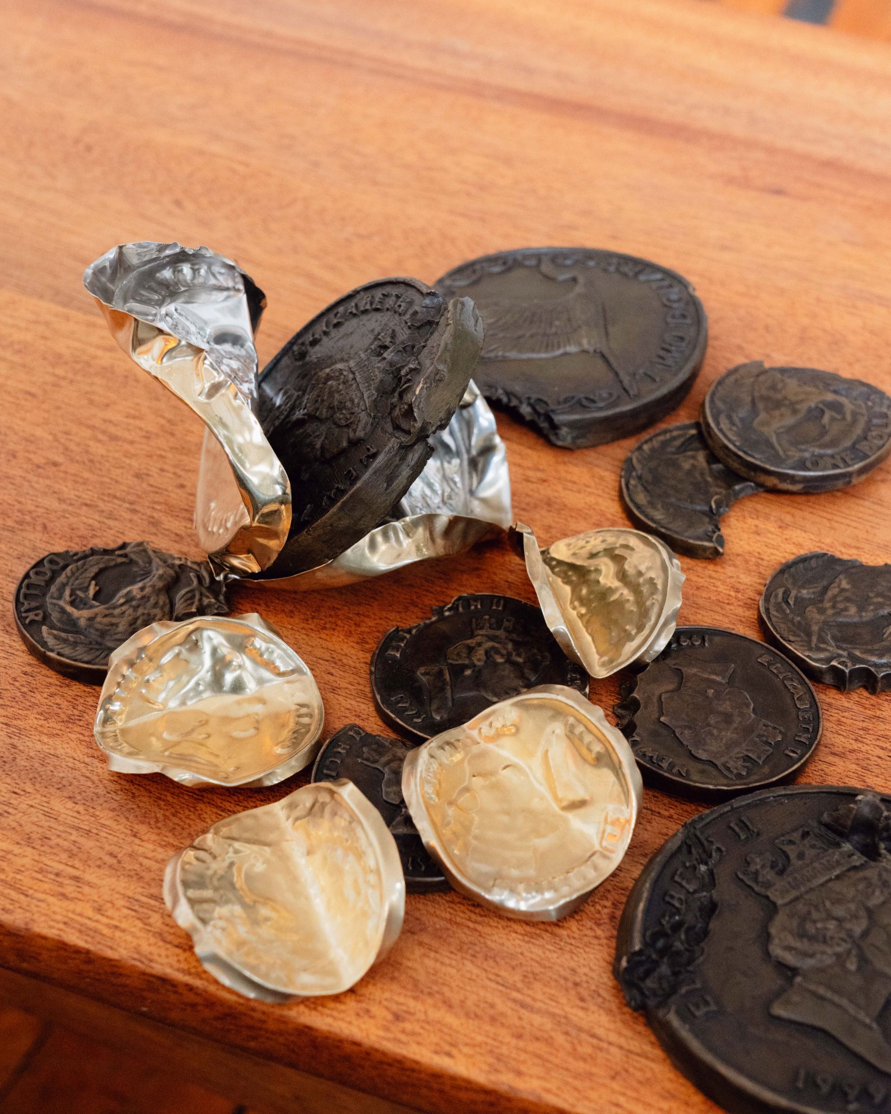 Cast in bronze, with wrappers made of gold plated steel and silver, Zac says the coins and their distinctive bite marks “play off a few different things”.