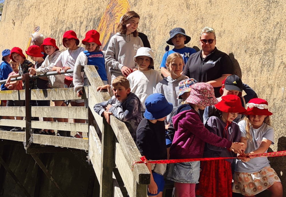 The ribbon cutting by the Out of School Care and Recreation children was part of a small ceremony, which included moa-nest cakes, to celebrate the community-led revitalisation of one of Ōamaru's lesser-known walkways under and near the Thames Street railway bridge.