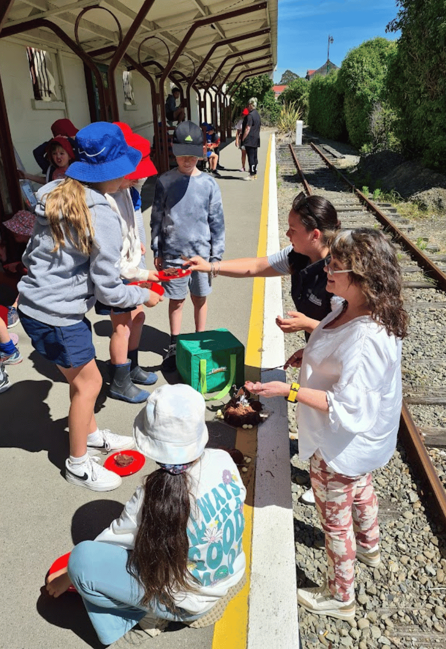 Eating cake "moa nests" complete with eggs (in miniature). Photo: Alex Regtien