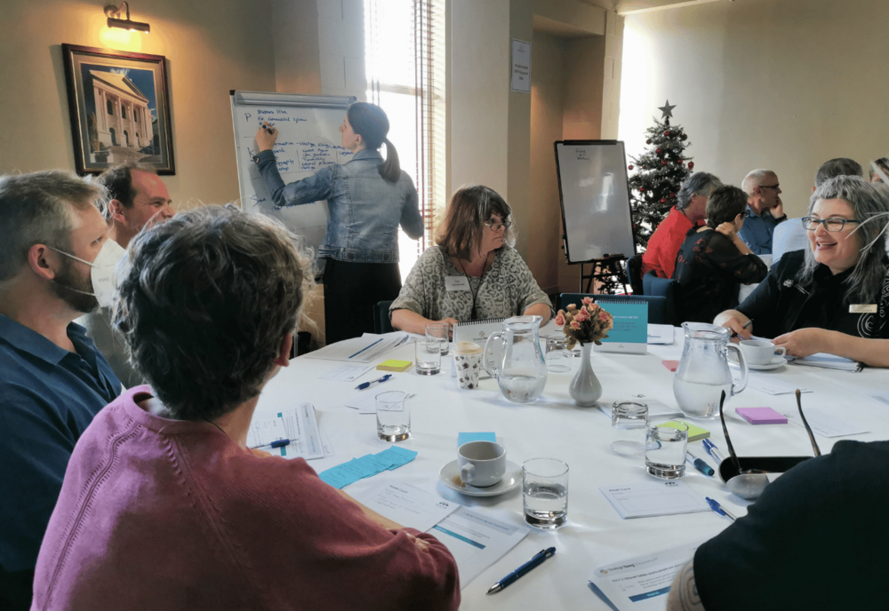 Back where it all began a year ago, the full project team including Lisa Heinz (formerly, Waitaki Whitestone UNESCO Global Geopark) at the whiteboard. Photo: Supplied WDC