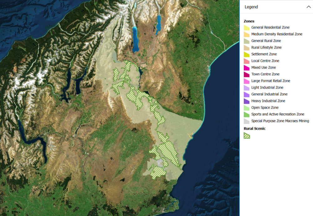The Rural Scenic Zone overlay is an example where permitted land use could have a future impact for property owners. Image: https://waitaki.isoplan.co.nz/review/
