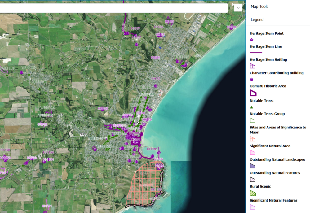 Various overlays in and around Ōamaru according to the ePlan. Image:https://waitaki.isoplan.co.nz/review/